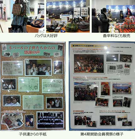 - ・ ネパール・シナプス自立支援協会のブースでは、ネパールのお母さん達がつくった小物やバッグを販売しました。また、今までの支援や視察についてまとめたパネルも展示。 現地の子供達からの手紙も、併せて展示されました。